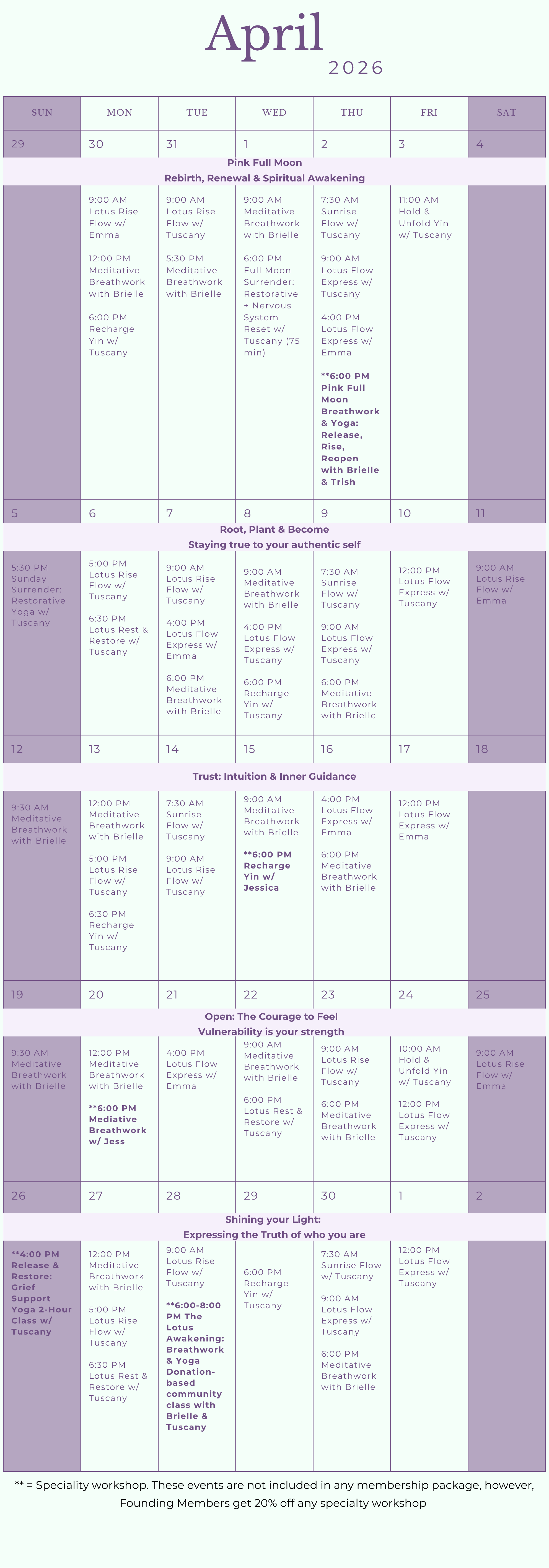 A look at the month ahead at The Lotus Collective. Every week we have a theme we focus on, although classes will always meet you where you are at and give you what you need in that moment, regardless of the theme! We will update before the start of each new month.